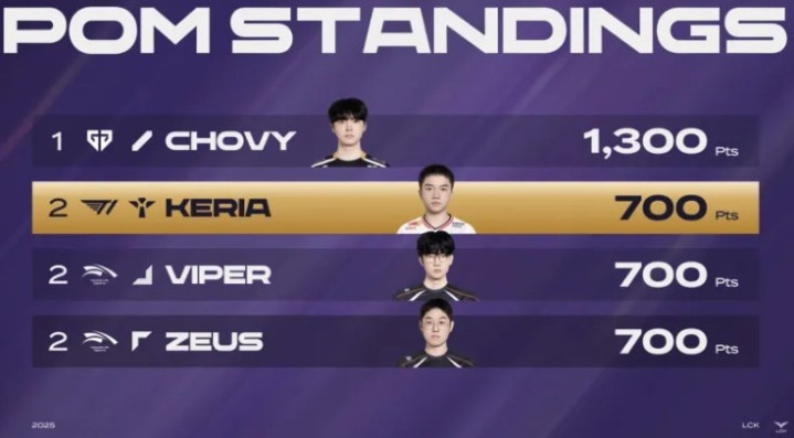 目前Keria以700点POM点数和Viper、Zeus并列排在第二,仅次于Chovy的1300点。